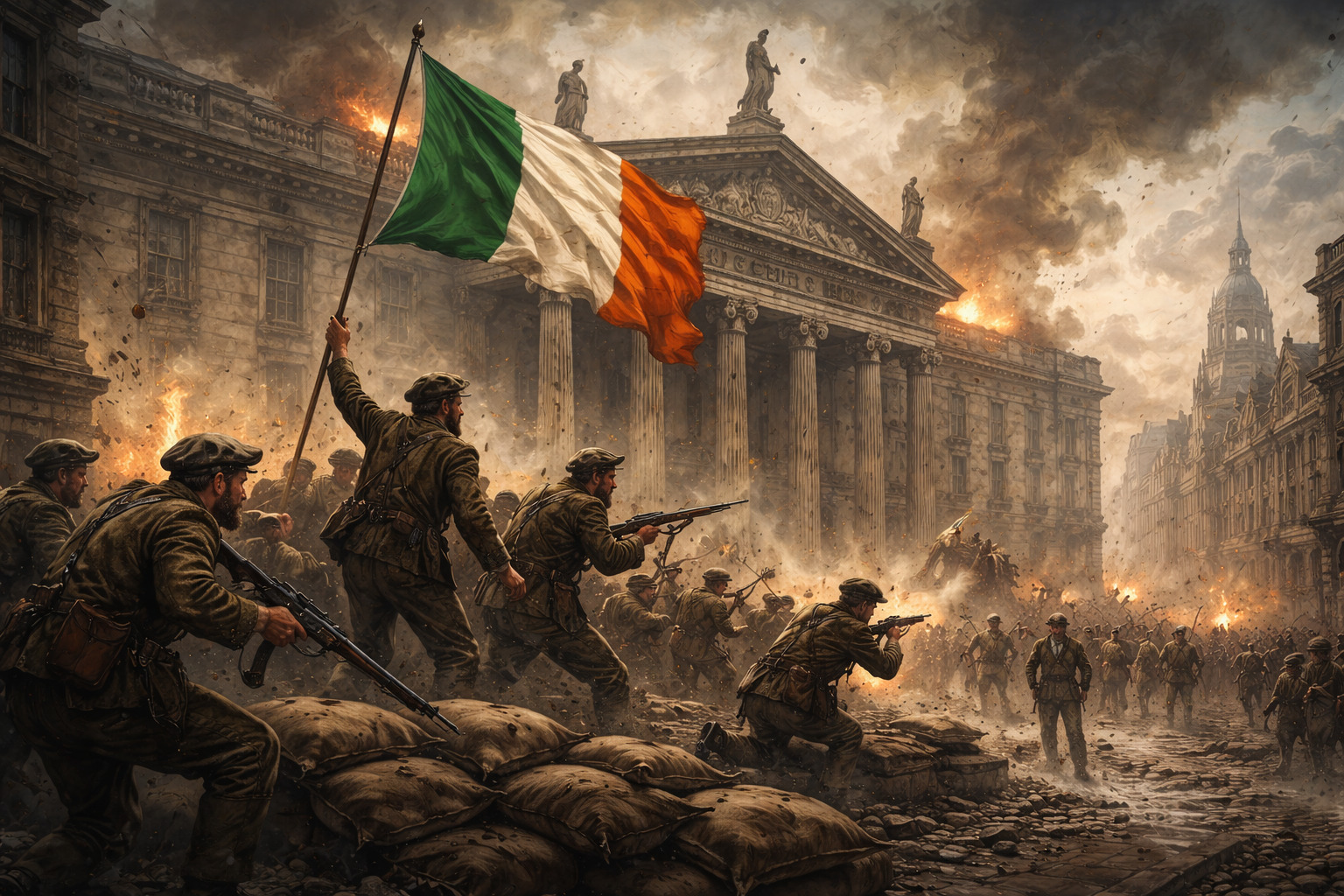 Militarily, the uprising was doomed from the start. British forces quickly deployed thousands of troops to Dublin, supported by artillery and naval guns positioned along the River Liffey. After several days of intense fighting, much of the city centre was badly damaged.